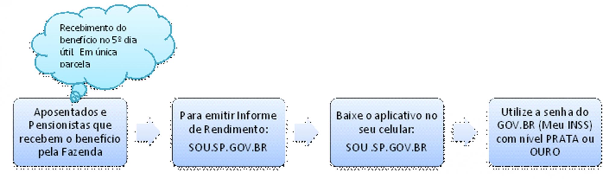 Para emitir o informe de pagamentos, os beneficiários com a folha processada na Fazenda deverão baixar o aplicativo SOU.SP.GOV.BR no seu celular, utilizar o CPF e a senha cadastrada do Gov.br, nível prata ou ouro, isto é, as mesmas informações necessárias para acessar o Meu INSS.