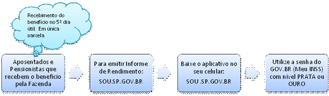 Para emitir o informe de pagamentos, os beneficiários com a folha processada na Fazenda deverão baixar o aplicativo SOU.SP.GOV.BR no seu celular, utilizar o CPF e a senha cadastrada do Gov.br, nível prata ou ouro, isto é, as mesmas informações necessárias para acessar o Meu INSS.