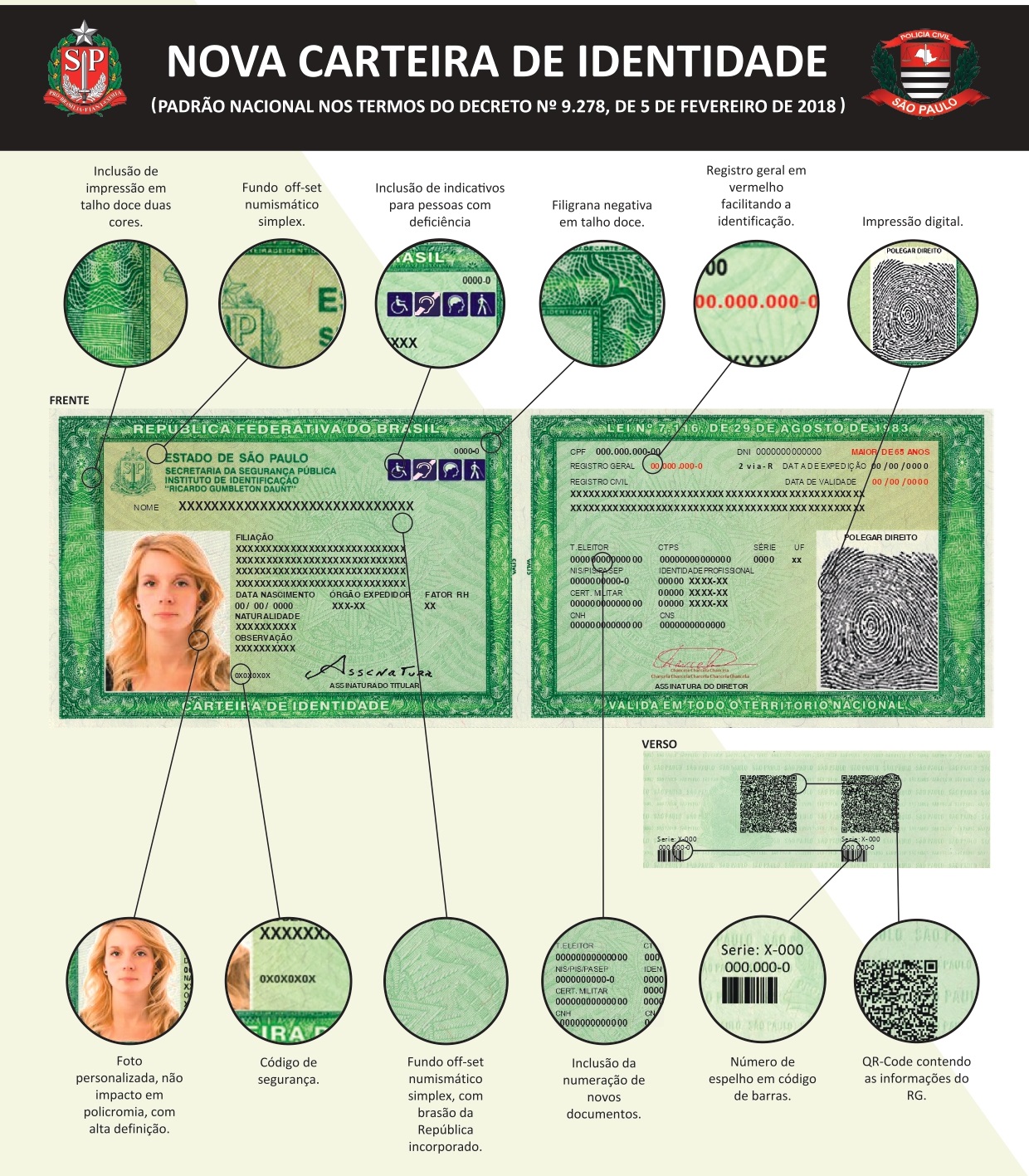 O Estado de São Paulo passou a emitir, no mês de agosto, um novo modelo da carteira de identidade (RG). Os parâmetros do documento atenderão ao decreto federal 9.278 de 2018, que padroniza as novas cédulas de identidade. O prazo para que os Estados atendam a determinação é março de 2020.