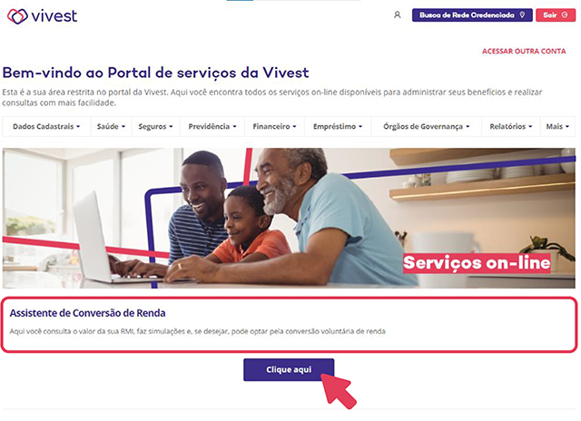 Para verificar o valor da RMI, basta acessar o Assistente de Conversão de Renda - uma ferramenta que traz todas as informações sobre o processo de conversão, disponível na página inicial da área exclusiva, , conforme a imagem abaixo: