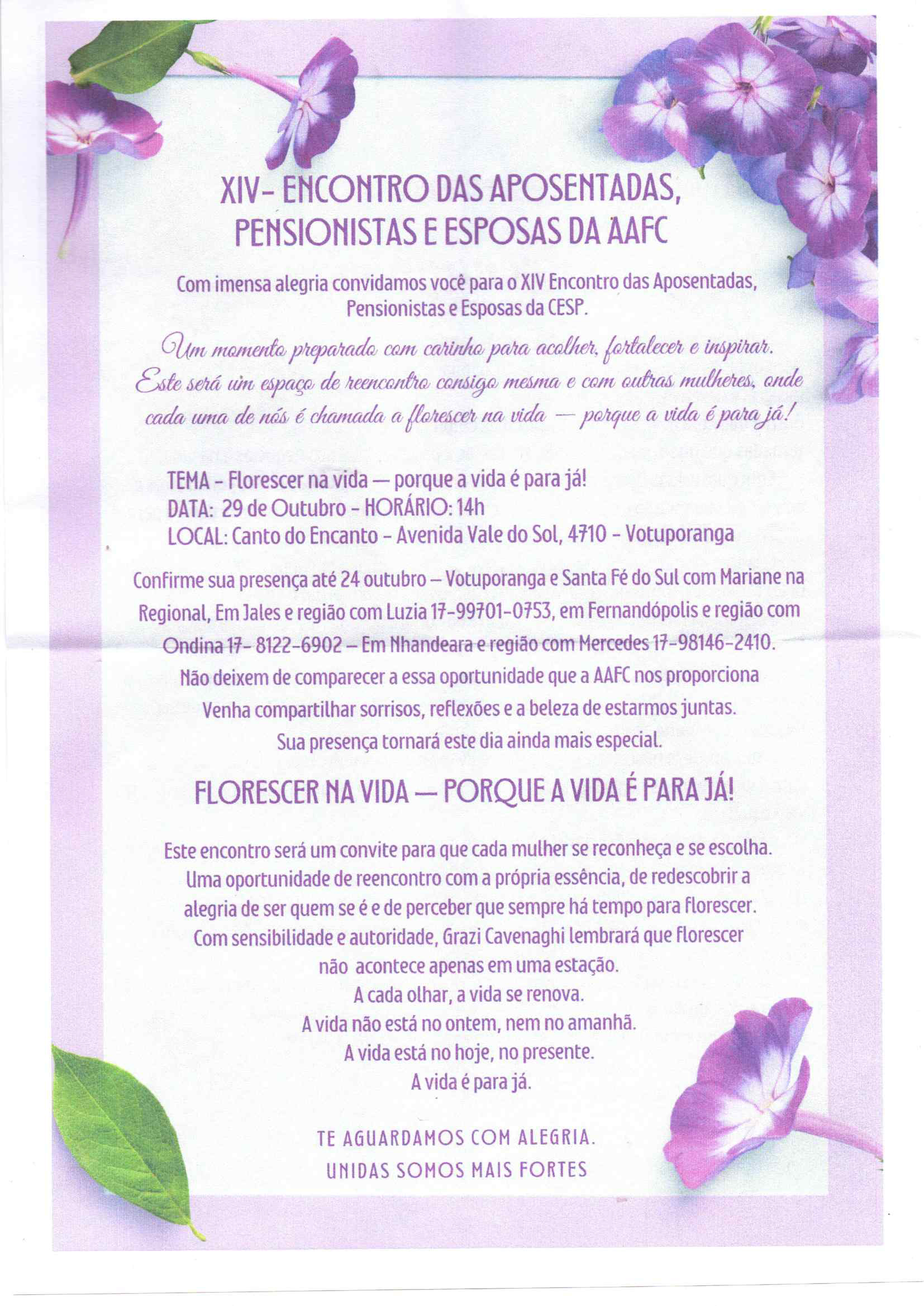 Elogiadíssimo em sua última edição, o próximo Encontro de Aposentadas e Pensionistas da Regional de Votuporanga será realizado em 29 de outubro 2025.